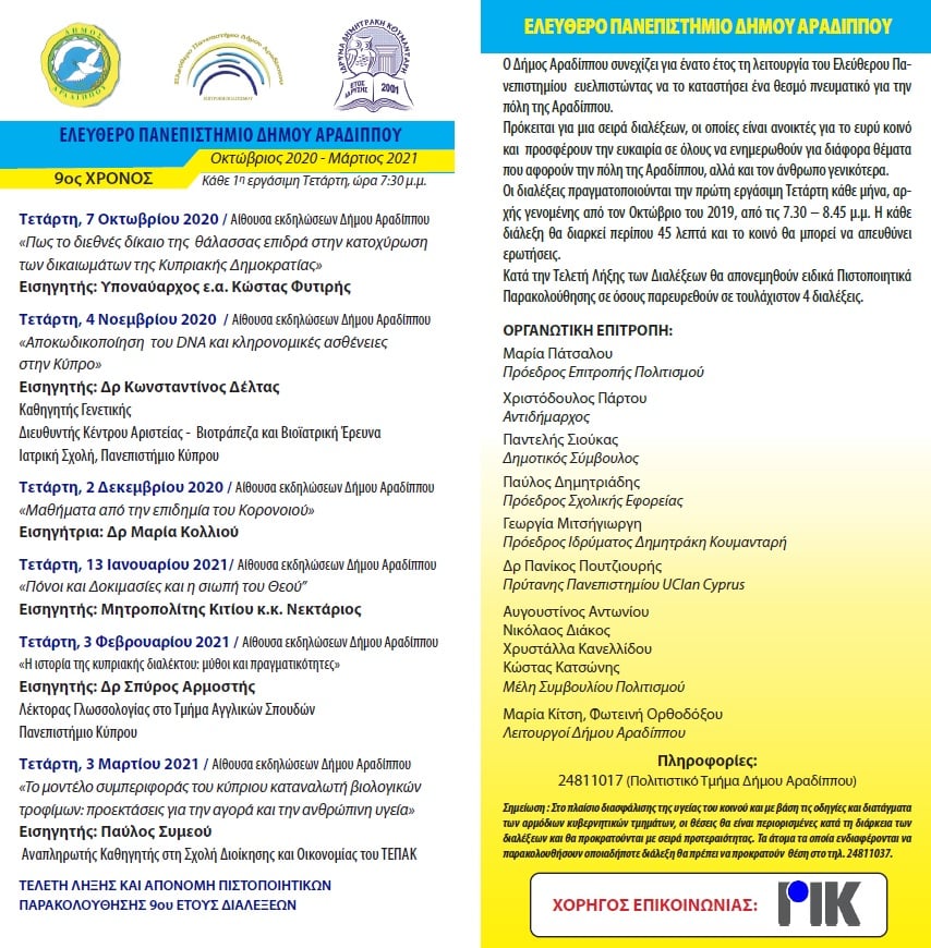 Ο Δήμος Αραδίππου επιδιώκοντας την πολιτιστική αναβάθμιση και πληροφόρηση των δημοτών του, συνεχίζει για ένατο έτος τη λειτουργία του Ελεύθερου Πανεπιστημίου εδραιώνοντας έτσι έναν θεσμό πνευματικό για την πόλη της Αραδίππου.