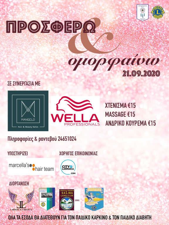 Η εκδήλωση θα πραγματοποιηθεί τη Δευτέρα 21 Σεπτεμβρίου όπου το κομμωτήριο Mangelo θα προσφέρει της συγκεκριμένης ημέρας, στην κλινική Παιδών του Μακάρειου Νοσοκομείου για την καταπολέμηση του παιδικού καρκίνου και παιδικού διαβήτη.