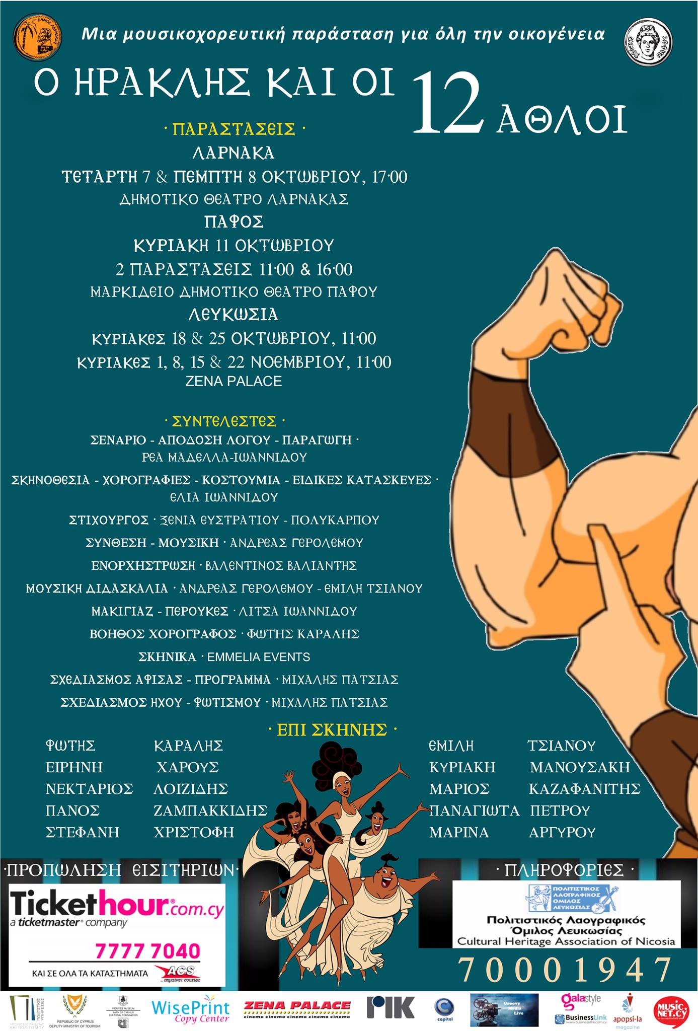 Ο Ηρακλής και οι 12 Άθλοι, μία μουσικοχορευτική παράσταση για όλη την οικογένεια, έρχεται στο Δημοτικό Θέατρο Λάρνακας, την Τετάρτη 7 και την Πέμπτη 8 Οκτωβρίου 2020, ώρα 17:00.