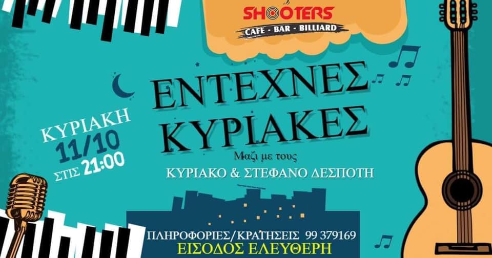 Έντεχνες Κυριακές στην πόλη μας με τους Κυριακό και Στέφανο Δεσπότη στο Shooters στη Λάρνακα, στις 11 Οκτωβρίου 2020, στις 21:00. Οι δύο νεαροί τραγουδιστές υποδέχονται  περιορισμένο αριθμό ατόμων σε ένα ωραίο και ζεστό χώρο στην πόλη μας. Είσοδος ελεύθερη.