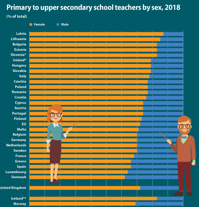 Σε όλα τα κράτη μέλη της ΕΕ, οι καθηγητές σχολείων το 2018 ήταν κυρίως γυναίκες. Ωστόσο, το ποσοστό των γυναικών δασκάλων ήταν το υψηλότερο στη Λετονία (87%) και στη Λιθουανία (85%), ακολουθούμενη από τη Βουλγαρία, την Εσθονία και τη Σλοβενία ​​(και το 83%).