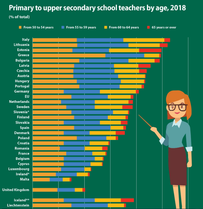39% εκπαιδευτικοί στα δημοτικά και δευτεροβάθμια σχολεία της ΕΕ ήταν 50 ετών και άνω το 2018. Στην Ιταλία, περισσότεροι από τους μισούς (54%) των εκπαιδευτικών ήταν σε αυτήν την ηλικιακή ομάδα, καθώς και στη Λιθουανία (52%). Ένας μεγάλος αριθμός εκπαιδευτικών συμμετείχε επίσης σε αυτήν την ηλικιακή ομάδα στην Εσθονία, την Ελλάδα και τη Βουλγαρία (και το 49%).