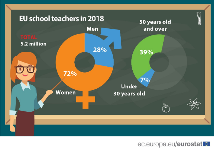 Στο σύνολο των ευρωπαϊκών χωρών, υπήρχαν 5,2 εκατομμύρια εκπαιδευτικοί. Οι γυναίκες αντιπροσώπευαν το μεγαλύτερο μέρος αυτού του εργατικού δυναμικού (72%, 3,7 εκατομμύρια εκπαιδευτικοί).