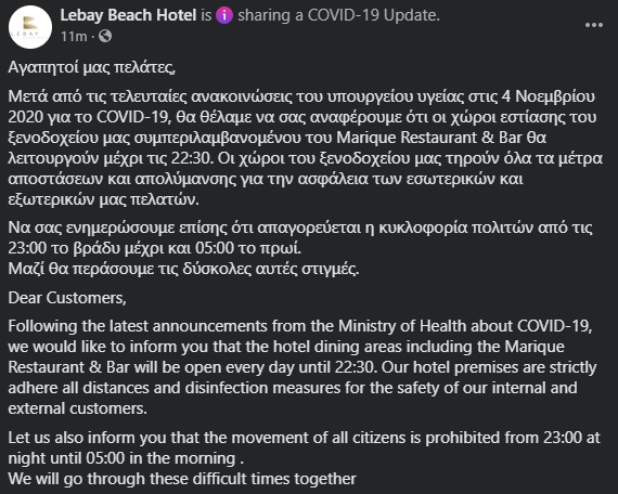 «Μετά από τις τελευταίες ανακοινώσεις του υπουργείου υγείας στις 4 Νοεμβρίου 2020 για το COVID-19, θα θέλαμε να σας αναφέρουμε ότι οι χώροι εστίασης του ξενοδοχείου μας συμπεριλαμβανομένου του Marique Restaurant & Bar θα λειτουργούν μέχρι τις 22:30. Οι χώροι του ξενοδοχείου μας τηρούν όλα τα μέτρα αποστάσεων και απολύμανσης για την ασφάλεια των εσωτερικών και εξωτερικών μας πελατών.