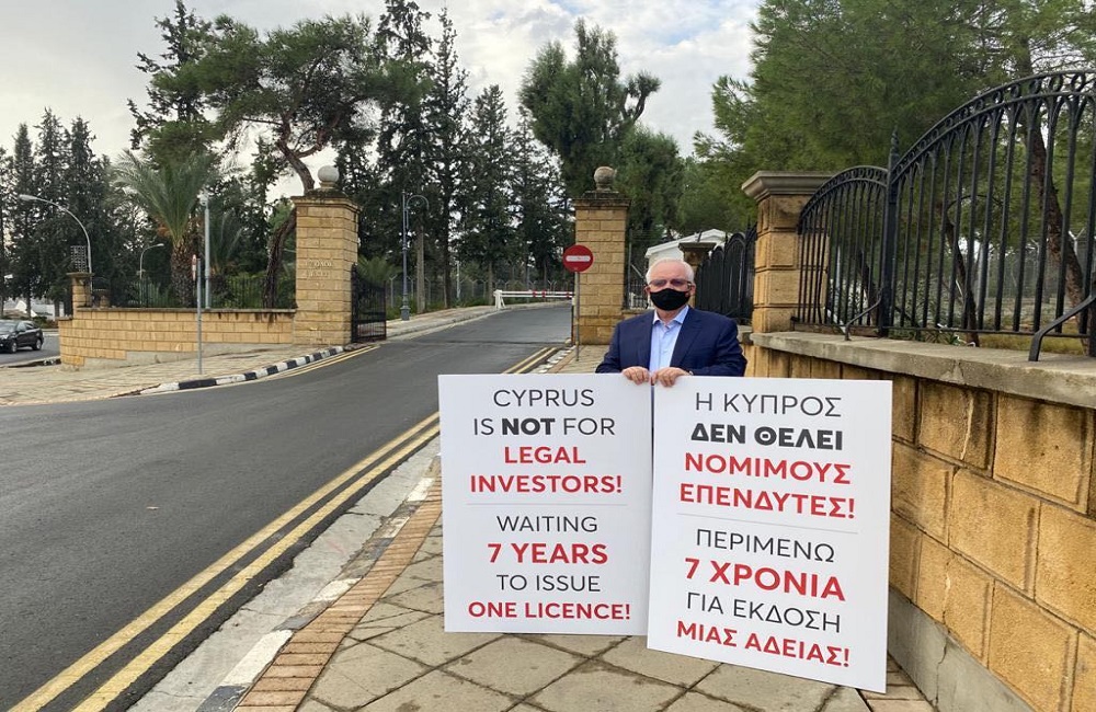 Με σύνθημα «Η Κύπρος δεν θέλει νόμιμους επενδυτές» Ρώσος επιχειρηματίας ο οποίος έχει κυπριακό διαβατήριο και ζει στην Κύπρο εδώ και τριάντα χρόνια, βρίσκεται αυτή την ώρα έξω από το Προεδρικό Μέγαρο και διαδηλώνει για μια άδεια οικοδομής που δεν εκδόθηκε ποτέ.