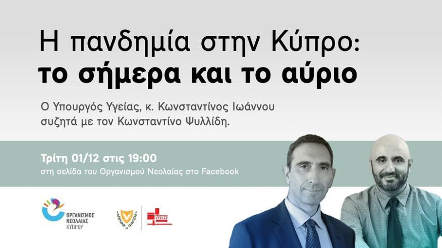 Στο πλαίσιο της προσπάθειάς του για έγκυρη ενημέρωση των νέων για τα θέματα που αφορούν την πανδημία του κορωνοϊού, ο Οργανισμός Νεολαίας Κύπρου διοργανώνει την Τρίτη 01 Δεκεμβρίου στις 19:00, διαδικτυακή συζήτηση του υπουργού Υγείας κ. Κωνσταντίνου Ιωάννου με τον Κωνσταντίνο Ψυλλίδη.