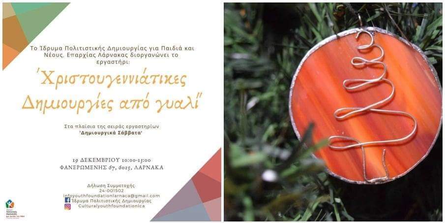 Το Ίδρυμα Πολιτιστικής Δημιουργίας για Παιδιά και Νέους, Επαρχίας Λάρνακας διοργανώνει το Εργαστήρι ‘Χριστουγεννιάτικες Δημιουργίες από γυαλί’, στα πλαίσια της σειράς Εργαστηρίων του Δημιουργικά Σάββατα.