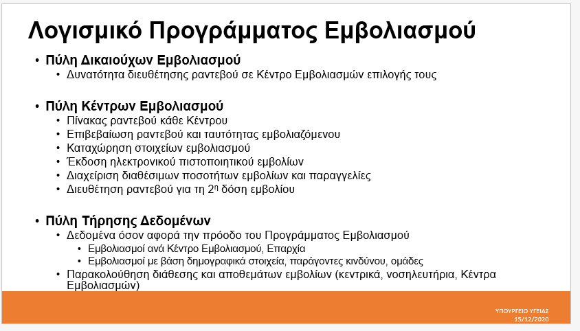 Στο κάθε κέντρο θα υπάρχει ηλεκτρονικός υπολογιστής με τον οποίο θα επιβεβαιώνονται τα ραντεβού, θα καταχωρίζονται τα στοιχεία του εμβολιασμού και θα εκδίδεται ηλεκτρονικό πιστοποιητικό.Επίσης θα γίνεται η διαχείριση των διαθέσιμων εμβολίων. Οι πολίτες θα ενημερώνονται και οι ίδιοι θα επιβεβαιώνουν το ραντεβού τους μέσω sms. Το λογισμικό θα κάνει τον διαχωρισμό των ομάδων των πολιτών που θα πρέπει να εμβολιαστούν. Θα δοθεί προτεραιότητα σε ευπαθείς ομάδες. Προτεραιότητα θα έχουν οι ένοικοι και οι εργαζόμενοι σε οίκους ευγηρίας και οι επαγγελματίες υγείας στα νοσηλευτήρια με ασθενείς covid-19.