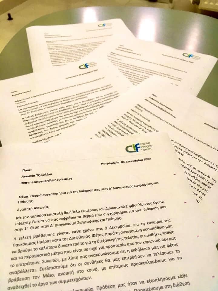 Τον Δεκέμβριο του 2019 με αφορμή την Παγκόσμια μέρα κατά της διαφθοράς, διοργανώσαμε στο σχολείο δράσεις και μαθήματα όπου καλλιεργήσαμε την έννοια του ενεργού και τίμιου πολίτη. Μερικές από τις εργασίες των παιδιών στάλθηκαν ως συμμετοχές στον 4ο Διαγωνισμό Ποίησης και Ζωγραφικής του Κυπριακού Φόρουμ Ακεραιότητας – Cyprus Integrity Forum.