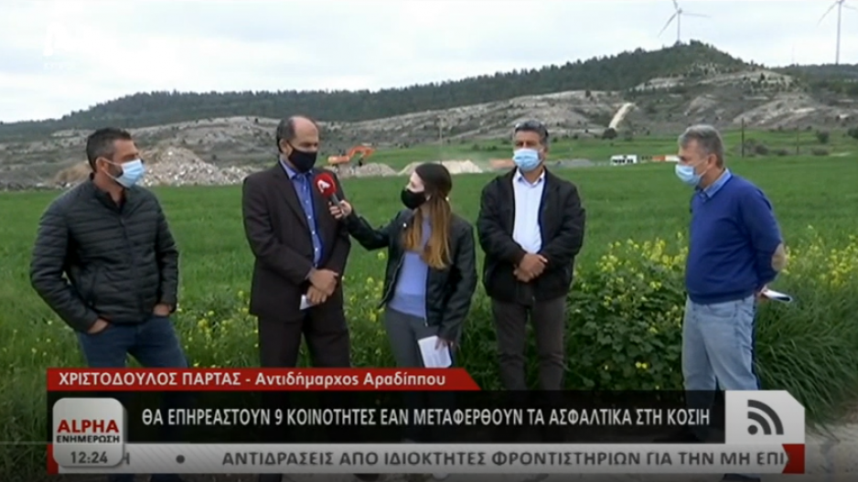 Όχι” στη μεταφορά των ασφαλτικών εργοστασίων από το Γέρι και το Τσέρι στην περιοχή της Κόσιης, λένε περισσότεροι από τέσσερις χιλιάδες κάτοικοι που έχουν καταθέσει ενυπόγραφα την αντίδραση τους ενώπιον των αρμόδιων Υπουργών και των Κοινοβουλευτικών Επιτροπών. Συνεργείο της εκπομπής Alpha Ενημέρωση με τη δημοσιογράφο Όλγα Κωνσταντίνου βρέθηκε σήμερα στην περιοχή και κατέγραψε τις διαμαρτυρίες εκπροσώπων πέντε Δήμων και επτά Κοινοτήτων, που θεωρούν ότι θα επηρεαστούν από τη λειτουργία των εργοστασίων στην περιοχή τους.