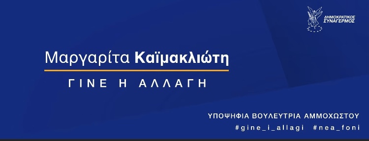 Η συμπολίτισσα μας Μαργαρίτα Καϊμακλιώτη αποτελεί μια από τις νεαρές επιλογές που θα έχει ΔΗ.ΣΥ στο ψηφοδέλτιο της επαρχίας Αμμοχώστου.  Νέα, γεμάτη εμπειρίες από το Ευρωκοινοβούλιο εισέρχεται στην πολιτική αρένα της Κύπρου και διεκδικεί την είσοδο της στη Βουλή, θέλοντας να αποδείξει με τη σειρά της ότι η πολιτική μπορεί να αποτελείται από καθαρά άτομα και να λειτουργούν με γνώμονα το συμφέρον του πολίτη και μόνο αυτού.