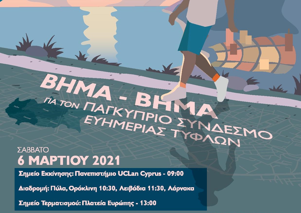 Με στόχο την οικονομική ενίσχυση του Παγκύπριου Συνδέσμου Ευημερίας Τυφλών (ΠΣΕΤ) στο πλαίσιο πρωτοβουλίας «Βήμα-Βήμα την Κύπρο», και σε συνεργασία με το University of Central Lancashire Cyprus (UCLan Cyprus), το Σάββατο 6 Μαρτίου 2021 θα πραγματοποιηθεί πεζοπορία από τον εθελοντή πεζοπόρο, Αλέξη Σοφοκλέους.