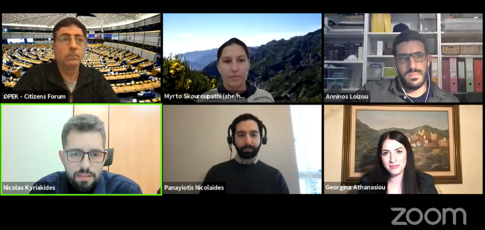 Τη διαφθορά στη σύγχρονη Κυπριακή κοινωνία συζήτησαν οι: Άννινος Λοΐζου, οικονομολόγος και μέλος του ΔΣ ΟΠΕΚ, Γεωργία Αθανασίου, δικηγόρος και Πρόεδρος του ΔΣ Oxygono και Μέλος Επιτροπής Διαφάνειας, Θεσμών και Δικαιοσύνης της Παράλληλης Βουλής, Μυρτώ Σκουρουπάθη, μηχανικός Περιβάλλοντος και μέλος της Πρωτοβουλίας «Αυλή», Νικόλας Κυριακίδης, δικηγόρος, ακαδημαϊκός και Αντιπρόεδρος του ΔΣ Oxygono και Παναγιώτης Νικολαΐδης, οικονομολόγος, μέλος του Ευρωπαϊκού Φορολογικού Παρατηρητηρίου και μέλος της Εκτελεστικής Επιτροπής Oxygono, στο πλαίσιο διαδικτυακής συζήτησης με θέμα «Πέντε νέοι συζητούν την διαφθορά» – Διεκδικώντας ένα σύγχρονο ευρωπαϊκό κράτος.