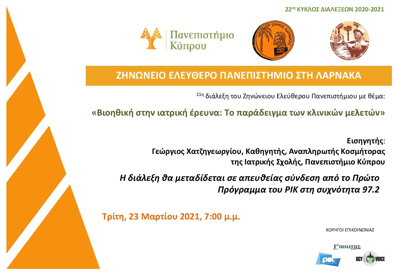 Το Ζηνώνειο Ελεύθερο Πανεπιστήμιο στη Λάρνακα μέσα στα πλαίσια του 22ου κύκλου διαλέξεων του, πραγματοποιεί την Τρίτη 23 Μαρτίου 2021, στις 7 μ.μ. την 11η διάλεξη του με θέμα “Βιοηθική στην ιατρική έρευνα: Το παράδειγμα των κλινικών μελετών”.