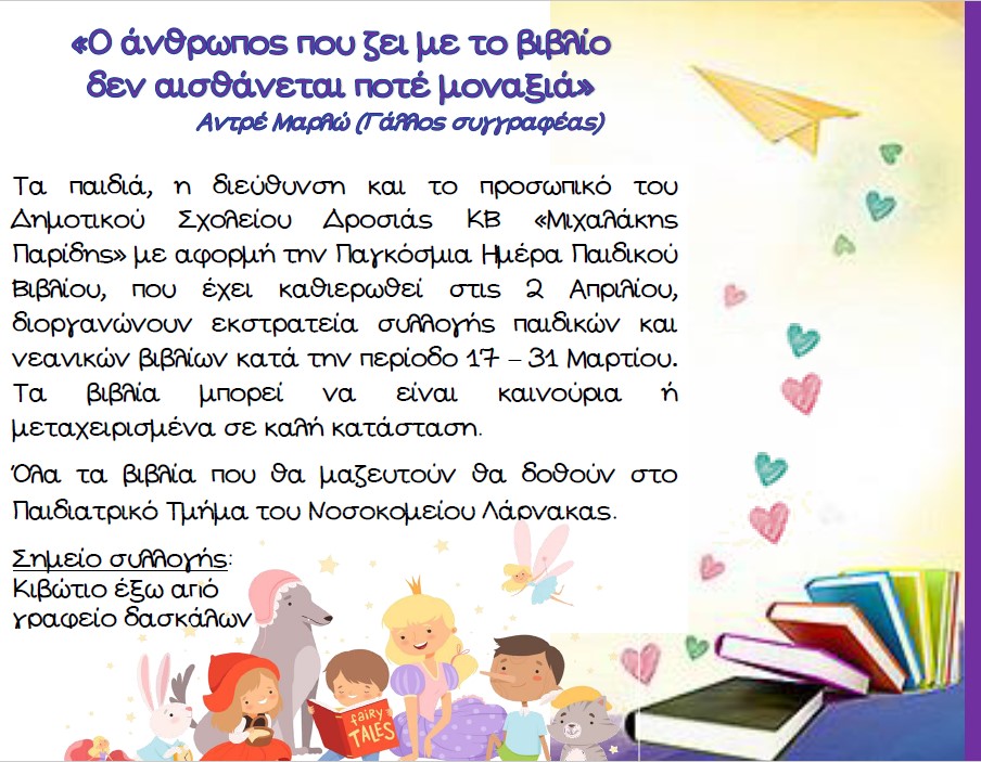 Τα παιδιά, η διεύθυνση και το προσωπικό του Δημοτικού Σχολείου Δροσιάς Κ.Β’ – «Μιχαλάκης Παρίδης» στη Λάρνακα, με αφορμή την Παγκόσμια Ημέρα Παιδικού Βιβλίου, που έχει καθιερωθεί στις 2 Απριλίου, διοργανώνουν εκστρατεία συλλογής παιδικών και νεανικών βιβλίων κατά την περίοδο 17 – 31 Μαρτίου.
