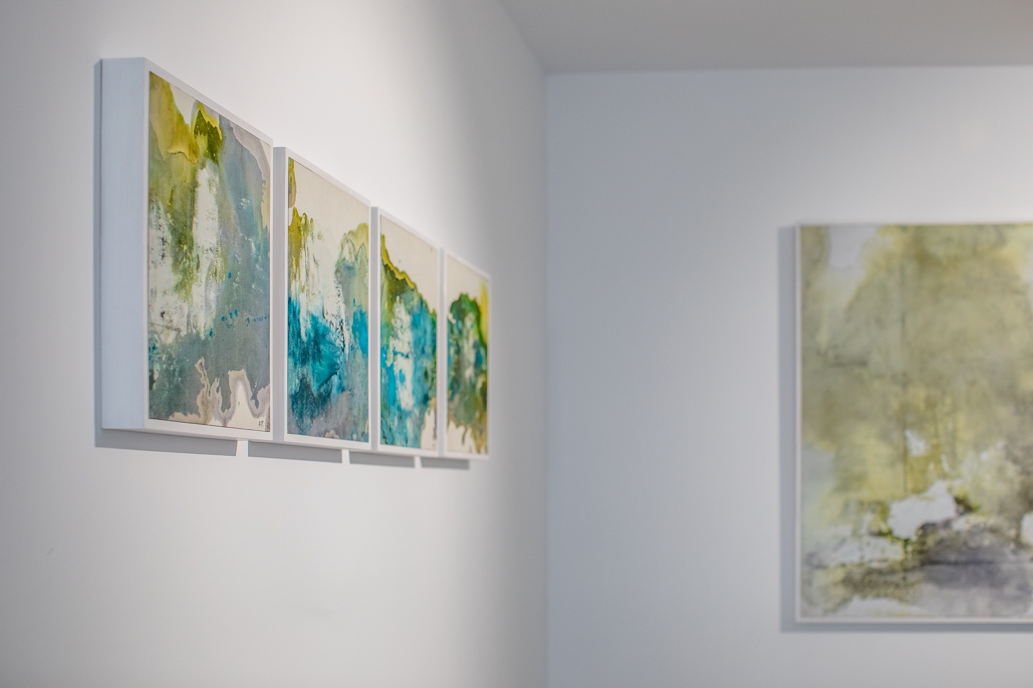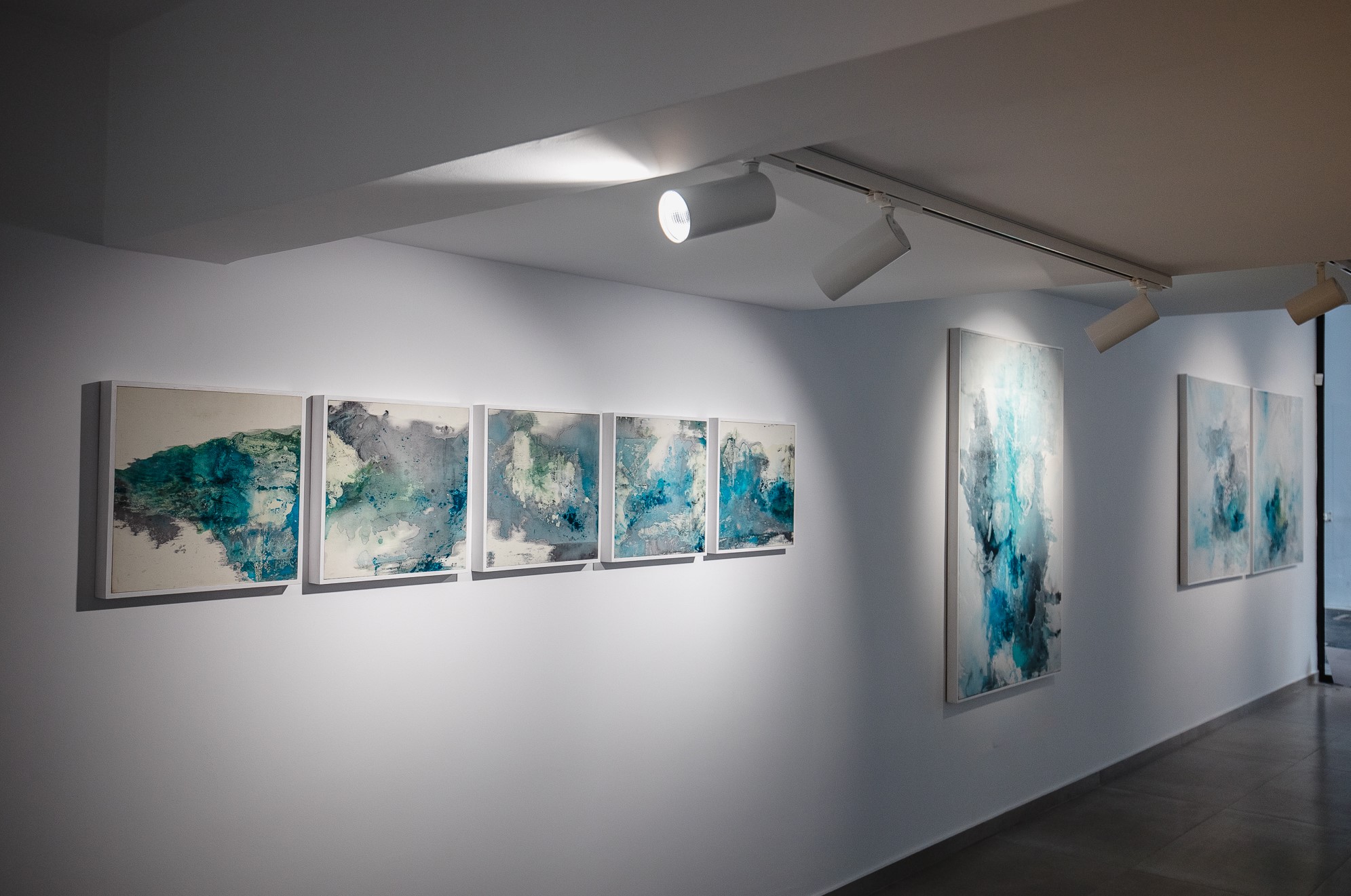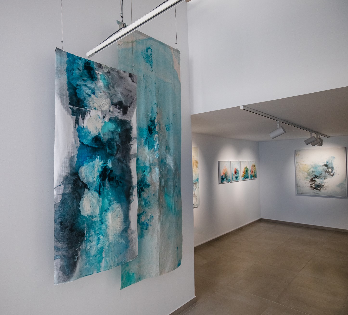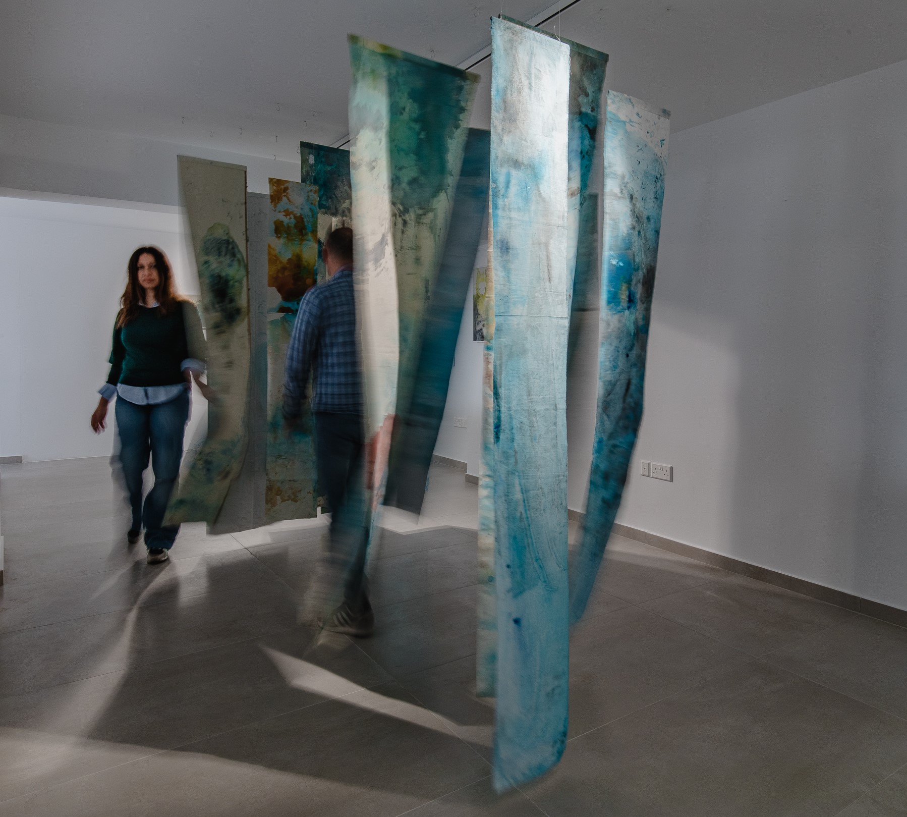 Η χρήση υφασμάτων ως επιφάνεια αλλά και ως εργαλείο ζωγραφικής, προσθέτει μια ομοιογενή αιθέρια αίσθηση στα έργα, φέρνοντας στο χώρο της έκθεσης μια εντύπωση ρευστότητας και κίνησης, η οποία καθορίζει την εμπειρία συνεύρεσης με θαλάσσια τοπία. Η υλική υπόσταση αυτών των επιφανειών γίνεται εμφανής στα έργα που παρουσιάζονται, ως ένα μέσο που (επανα)προσδιορίζει τις μεθόδους και τεχνικές της εικαστικού, αλλά και που επηρεάζει τον τρόπο εγκατάστασης των έργων στο χώρο, χρησιμοποιώντας την αιθέρια και διαφανή ποιότητα των υφασμάτων αυτών, και την ευαισθησία τους προς τις συνθήκες που τα περιβάλλουν.
