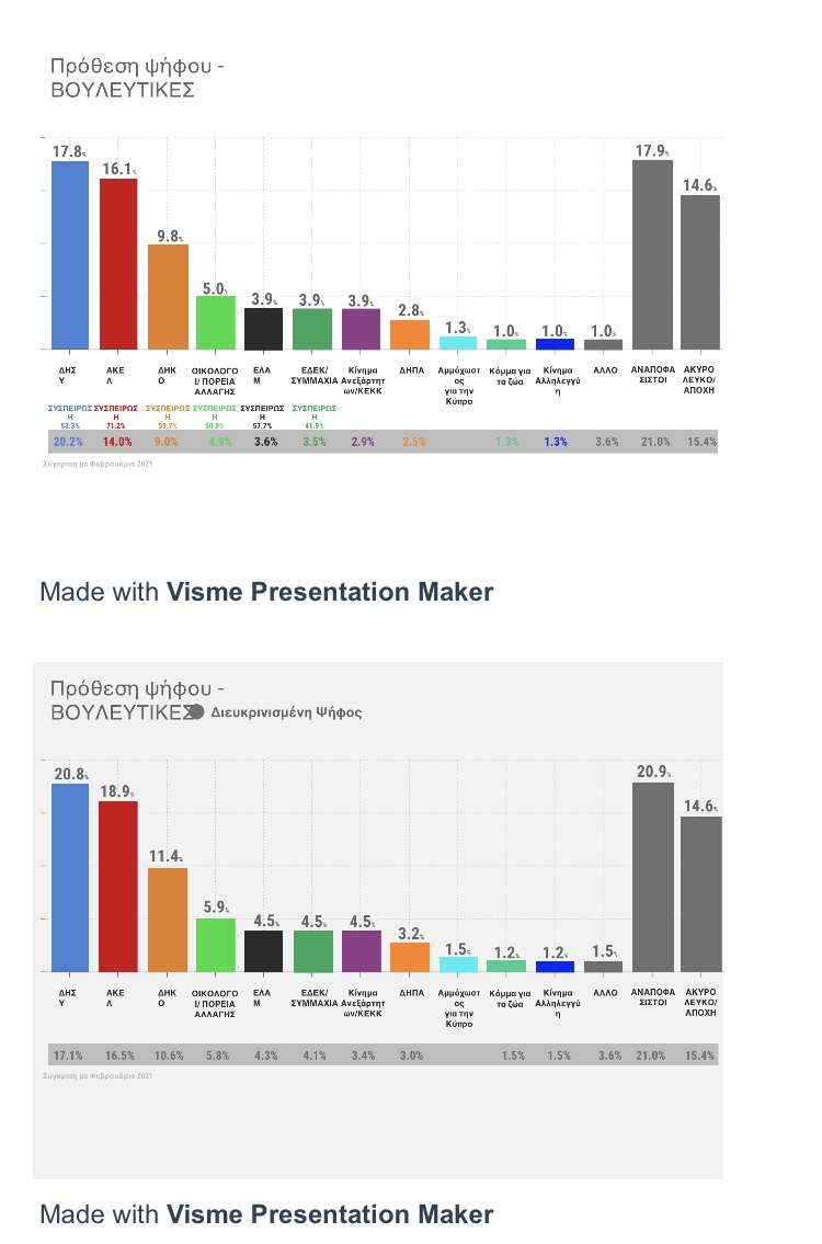 Σε χαμηλές πτήσεις εξακολουθεί να κινείται η κυβέρνηση Νίκου Αναστασιάδη και ο ΔΗΣΥ με τους χειρισμούς που γίνονται σε Κυπριακό, διαφθορά και πανδημία να μην ικανοποιούν την πλειοψηφία των ερωτηθέντων. Ο ΔΗΣΥ αδυνατεί να συσπειρωθεί και βλέπει το ΑΚΕΛ να το πλησιάζει, χωρίς να αποκλείεται να παιχτεί και το ποιος θα λάβει την πρωτιά.