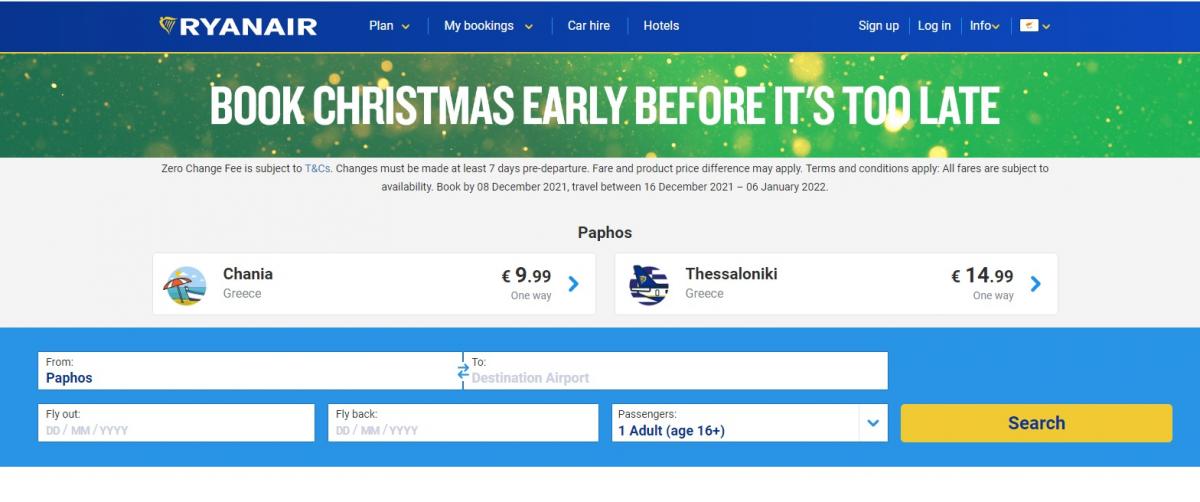 Αν λοιπόν σκέφτεσαι να κάνεις κάποιο ταξίδι την περίοδο των Χριστουγέννων, μάθε ότι η Ryanair ανακοίνωσε πτήσεις από €9.99 για συγκεκριμένους προορισμούς για κρατήσεις που θα γίνουν μέχρι τις 08/12.