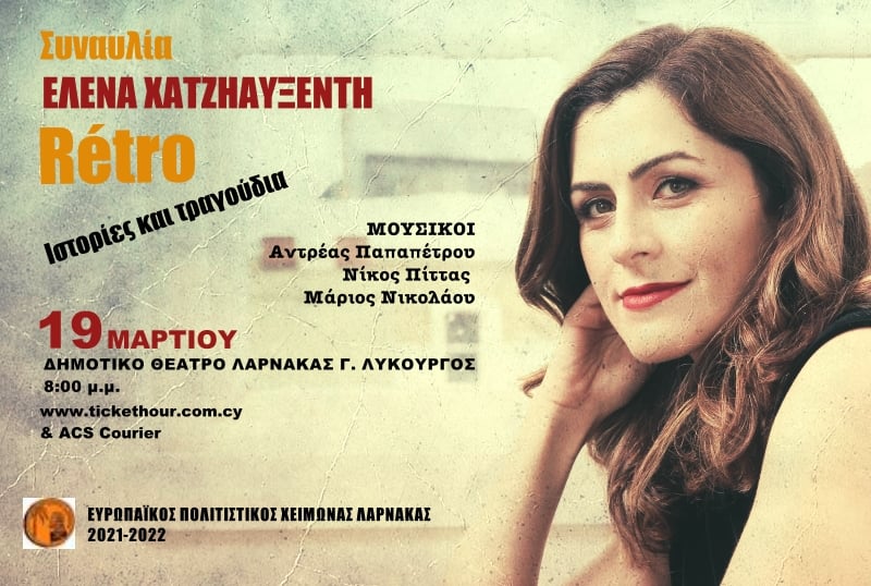 Το Σάββατο 19 Μαρτίου στις 8:00 μ.μ. στο ΔΗΜΟΤΙΚΟ ΘΕΑΤΡΟ Γ. ΛΥΚΟΥΡΓΟΣ θα λάβει χώρα η Συναυλία – Έλενα Χατζηαυξέντη «Rétro – Ιστορίες και ταξίδια».