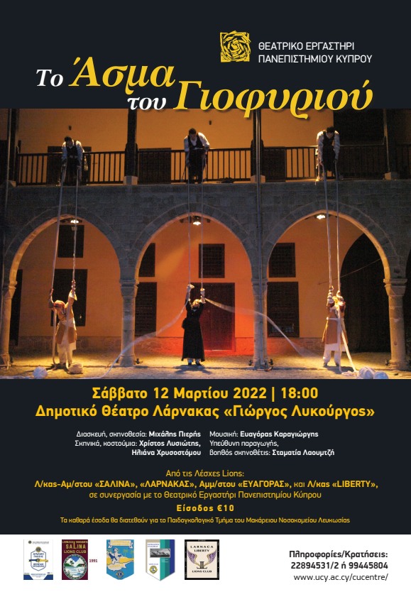 Το Σάββατο 12 Μαρτίου 2022 και ώρα 6:00 μ.μ. στο Δημοτικό Θέατρο Γ. Λυκούργος στη Λάρνακα το Θεατρικό Εργαστήρι Πανεπιστημίου Κύπρου «Το Άσμα του Γιοφυριού».