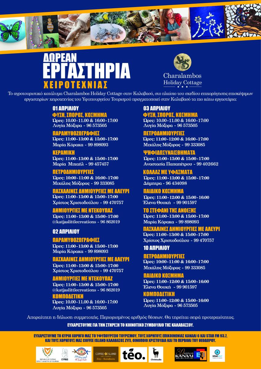 - Πετροδημιουργίες: «Κατάγομαι από την Λεμεσό ζω και δημιουργώ στο χωριό Καλαβασός. Την τέχνη μου την χαρακτηρίζει η μεικτή κατασκευή όπως η επεξεργασία υλικών της φύσης πέτρας-ξύλου-μετάλλου. Στα εργαστήρια θα δημιουργήσουμε με τον αυτό σχεδιασμό από πέτρες της θάλασσας φτιάχνοντας εικόνες και σχήματα όπως και με την χάραξη.» Μιχάλης Μόζορας 99333085.