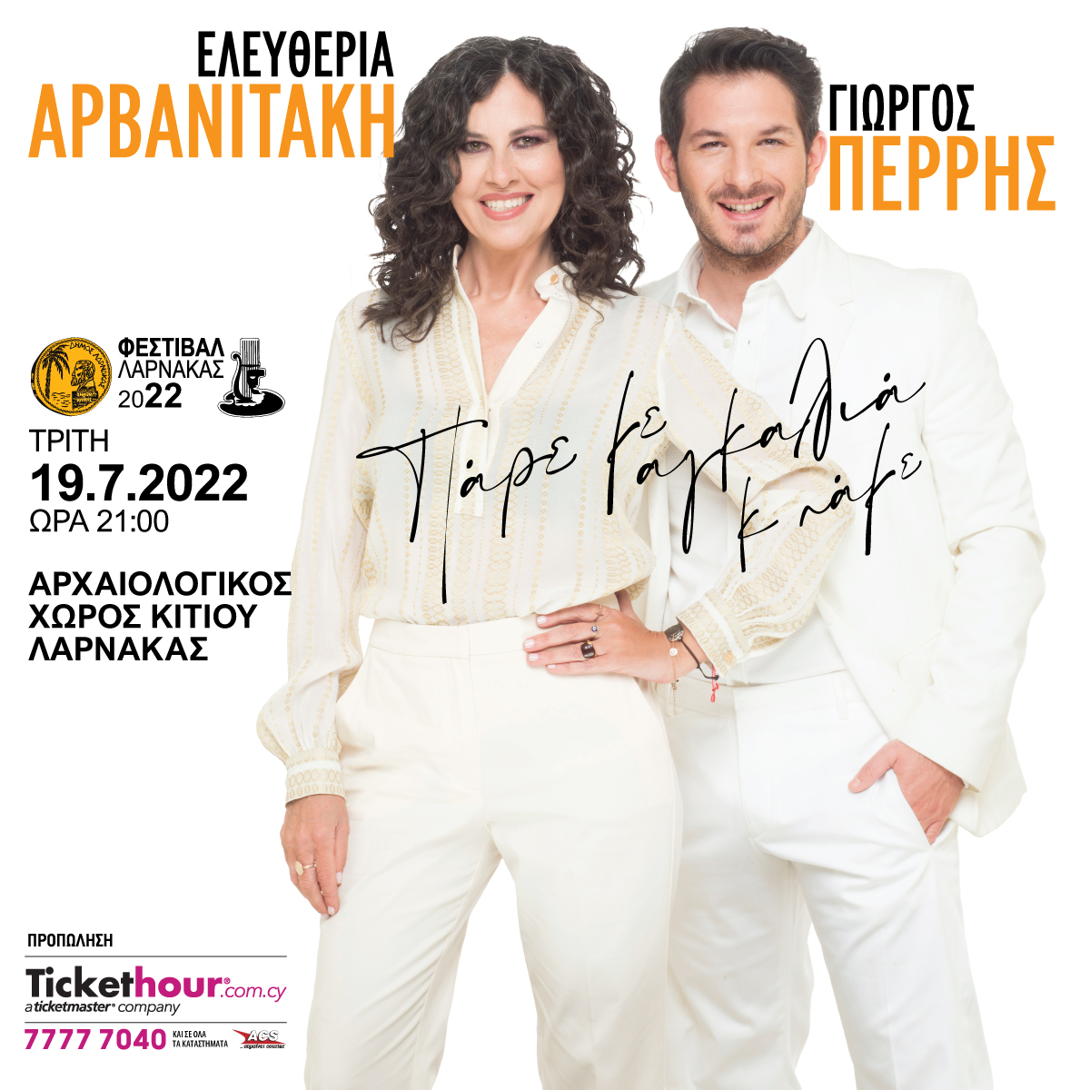 Στα πλαίσια του ΦΕΣΤΙΒΑΛ ΛΑΡΝΑΚΑΣ 2022, στον αρχαιολογικό χώρο Κιτίου στη Λάρνακα, την Τρίτη 19 Ιουλίου 2022 στις 9.00 μ.μ., διοργανώνεται η συναυλία «ΠΑΡΕ ΜΕ ΑΓΚΑΛΙΑ ΚΑΙ ΠΑΜΕ»  με τους ΕΛΕΥΘΕΡΙΑ ΑΡΒΑΝΙΤΑΚΗ – ΓΙΩΡΓΟΣ ΠΕΡΡΗΣ.