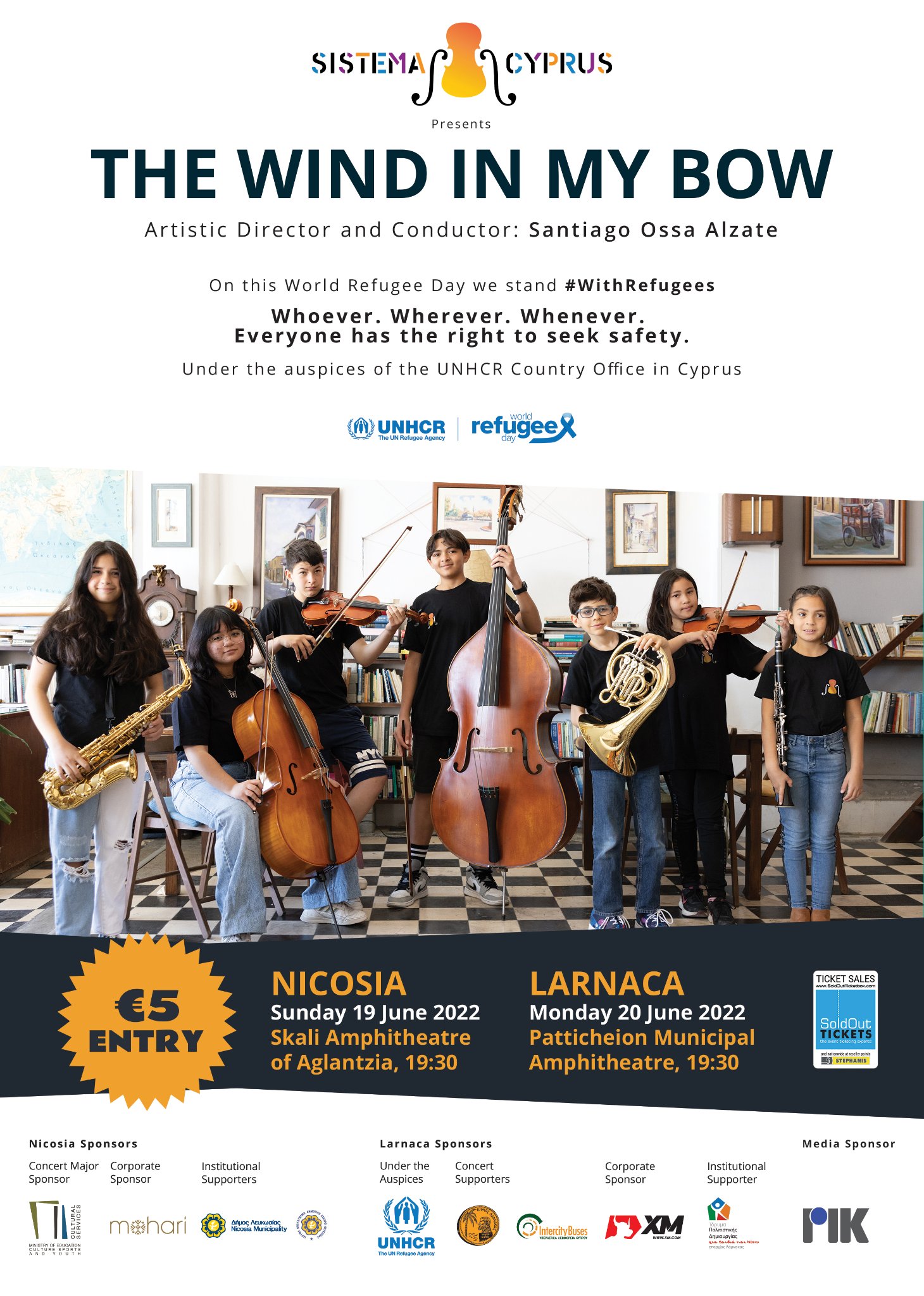 Με αφορμή την παγκόσμια ημέρα προσφύγων το Sistema Cyprus επιστρέφει με το αλαργοτάξιδο μήνυμα ‘The Wind in my Bow’, για δύο συναυλίες, κάτω από τον ανοιχτό ουρανό με την πρώτη, την Κυριακή 19 Ιουνίου στις 7:30μμ το απόγευμα στο Αμφιθέατρο Σκαλί Αγλαντζιάς, και τη δεύτερη, τη Δευτέρα 20 Ιουνίου στις 7:30μμ το απόγευμα στο Παττίχειο Δημοτικό Αμφιθέατρο Λάρνακας.