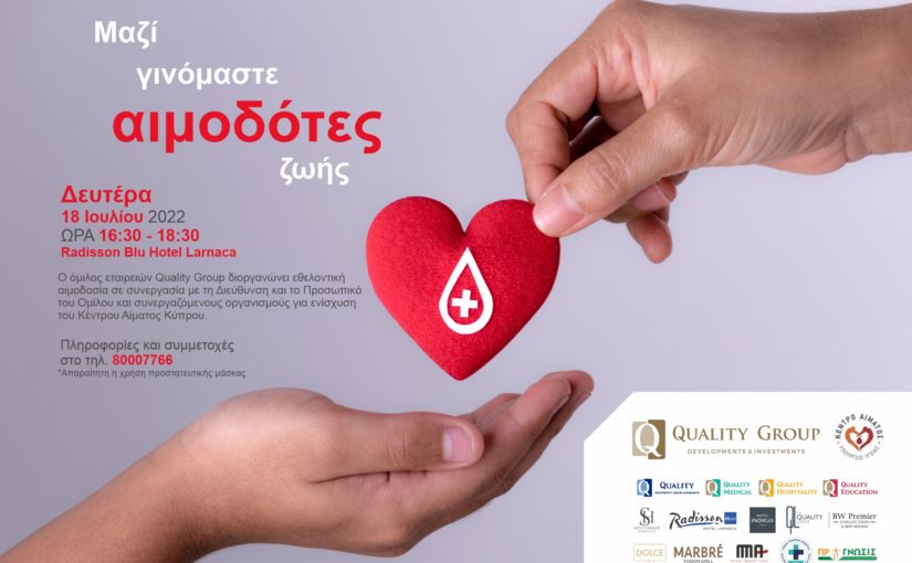 Στο πλαίσιο του Προγράμματος Εταιρικής Κοινωνικής Ευθύνης, ο όμιλος  εταιρειών Quality Group, διοργανώνει Εθελοντική Αιμοδοσία την Δευτέρα 18 Ιουλίου 2022, μεταξύ των ωρών 4:30μ.μ. – 6:30μ.μ, στο Radisson Blu Hotel Larnaca, στην αίθουσα Scala, στον 16ο όροφο του ξενοδοχείου.