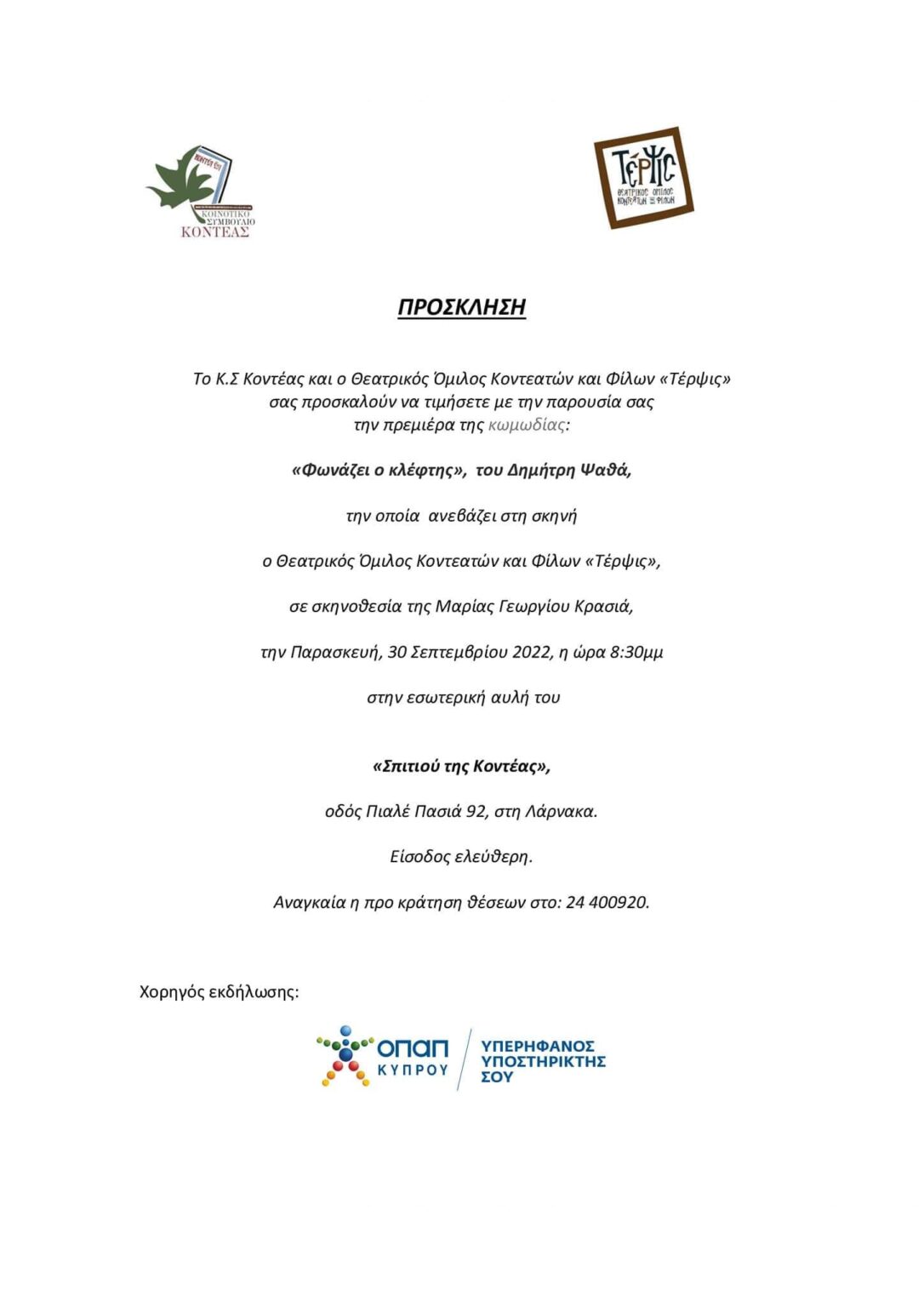 Έρχεται το έργο ” Φωνάζει ο κλέφτης” η κωμωδία του Δημήτρη Ψαθά σε σκηνοθεσία Μαρίας Γεωργίου Κρασιά, από τον Θεατρικό Όμιλο Κοντεατών και Φίλων Τέρψις.