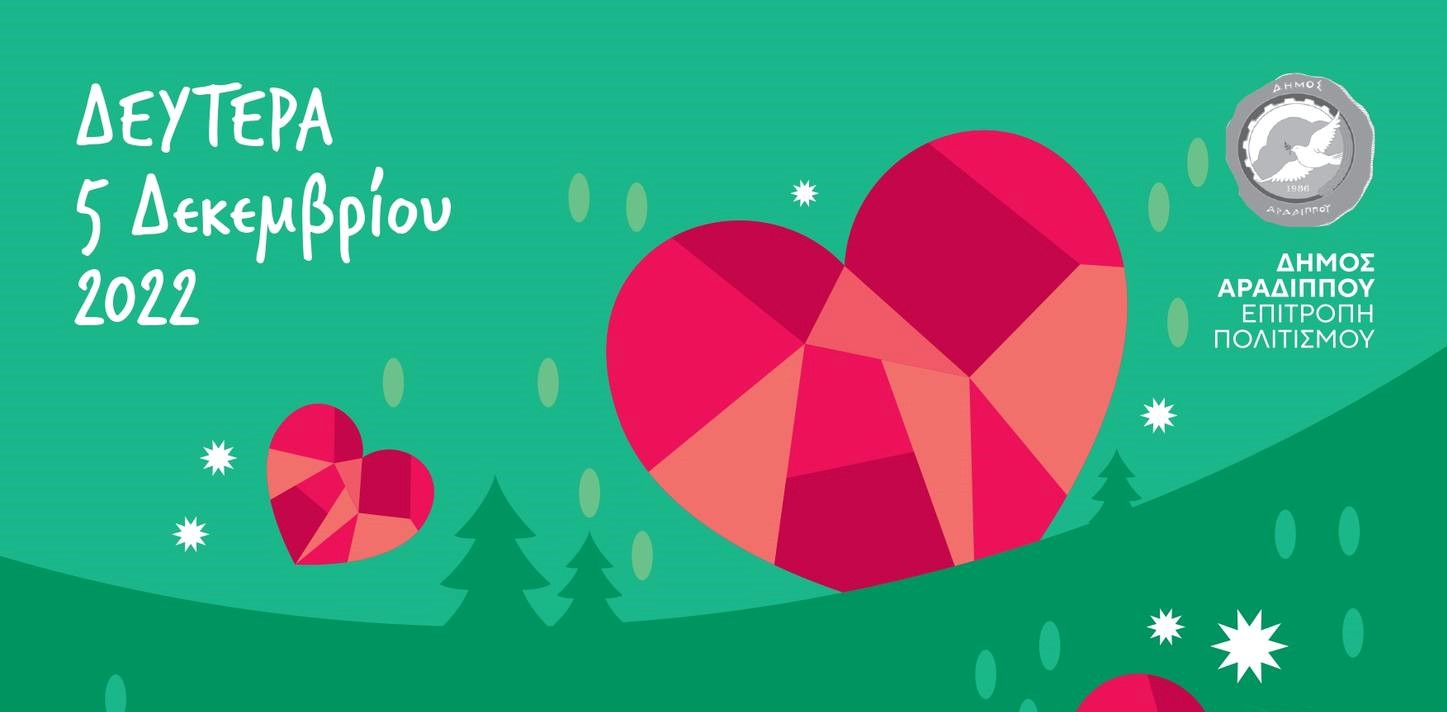 Στο πλαίσιο αυτό, τη Δευτέρα, 5 Δεκεμβρίου και ώρα 19.00, θα πραγματοποιηθεί στο Δημοτικό Μέγαρο Αραδίππου, διακόσμηση χριστουγεννιάτικου δέντρου με κεραμικές καρδούλες και θα ακολουθήσει μουσικό και χορευτικό πρόγραμμα.