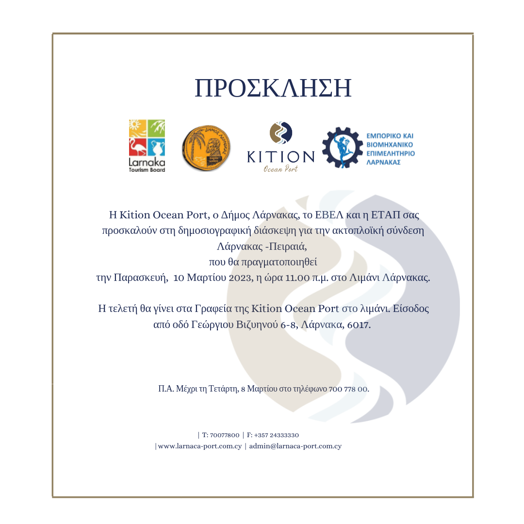 Η Kition Ocean Port, o Δήμος Λάρνακας, το ΕΒΕΛ και η ΕΤΑΠ σας προσκαλούν στη δημοσιογραφική διάσκεψη για την ακτοπλοϊκή σύνδεση Λάρνακας -Πειραιά,