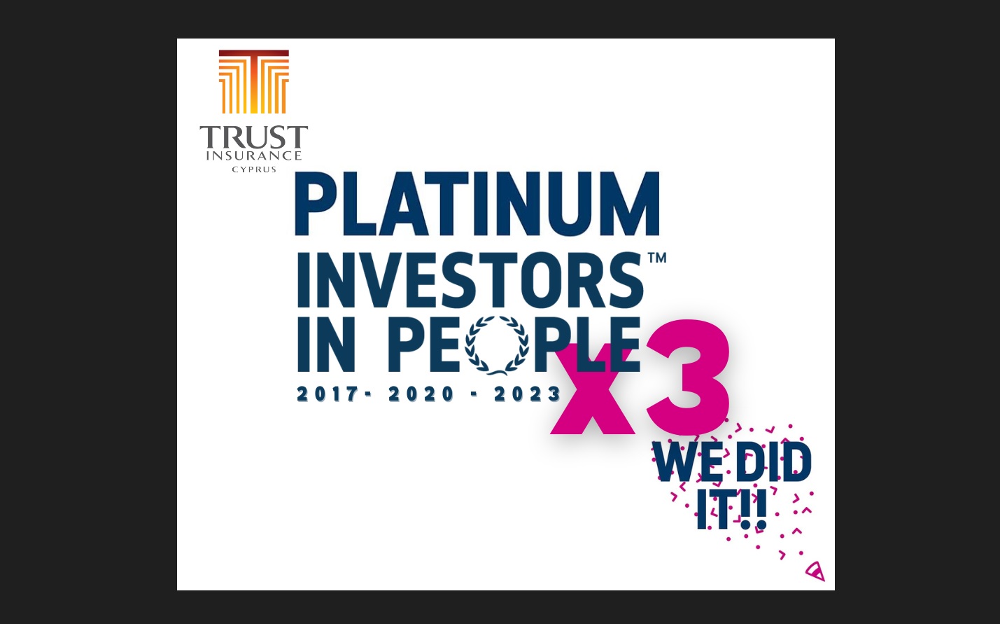 Για τρίτη συνεχόμενη φορά (2017-2020-2023) η TRUST Insurance Cyprus πιστοποιήθηκε από τον έγκριτο διεθνή οργανισμό Investors In People με το υψηλότερο πρότυπο Platinum Employer.