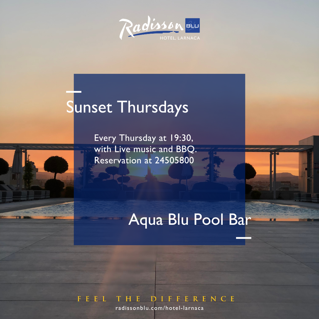 Η Λάρνακα κάθε Πέμπτη απολαμβάνει την απόλυτη εμπειρία του μαγευτικού ηλιοβασιλέματος, στο Aqua Blu Pool Bar, του Radisson Blu Hotel.