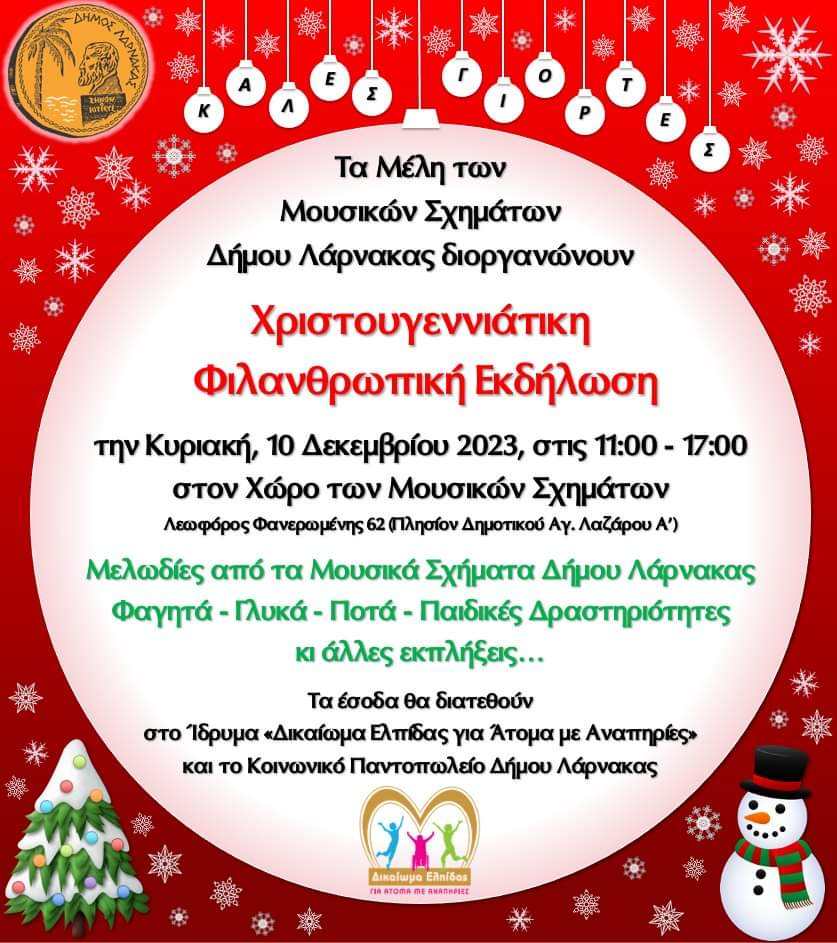 Τα Μέλη των Μουσικών Σχημάτων Δήμου Λάρνακας διοργανώνουν Χριστουγεννιάτικη Φιλανθρωπική Εκδήλωση, την Κυριακή 10 Δεκεμβρίου 2023 από τις 11:00 π.μ. μέχρι και 17:00, στον χώρο των Μουσικών Σχημάτων.